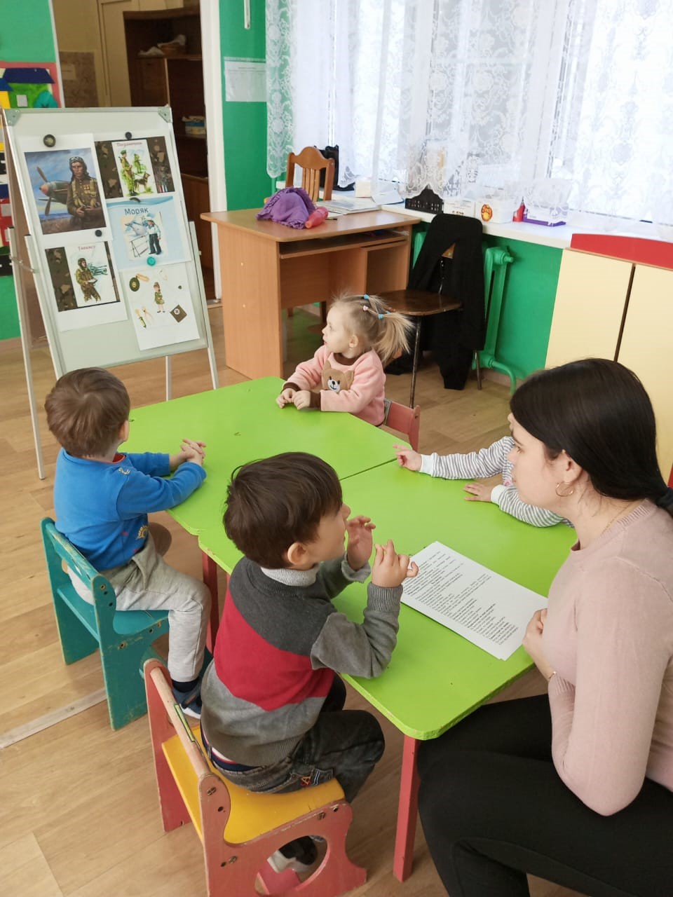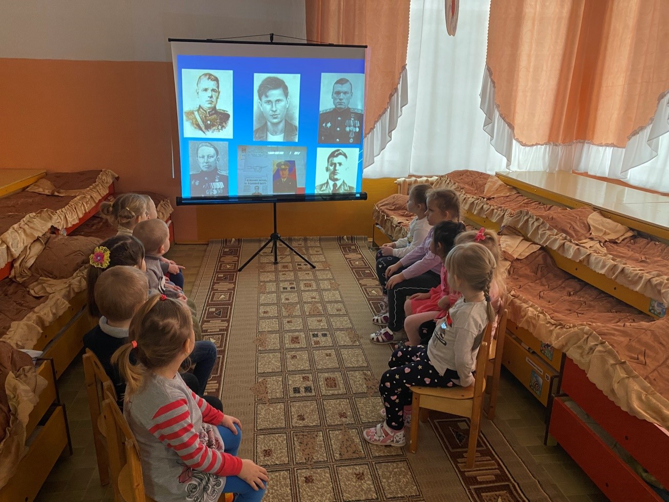 14 февраля в нашем детском саду прошло тематическое мероприятие «Сыны Отечества», посвящённое памяти земляков, погибших в годы ВОВ. В ходе просмотра презентации «Героические подвиги наших земляков», воспитанники познакомились с подвигами наших земляков, которые носят почетное звание Герой: Прудченков Ф.Н., Фомин Н.Н., Тюленин С.Г. и др. Также дети познакомились с Героем наших дней с нашим земляком Рязанцевым Александром Николаевичем-Героем Российской Федерации. Ребята узнали, где он родился, учился, служил, какой подвиг совершил. Очень интересно было детям узнать, что его именем названа улица в с. Корсаково и школа в с. Спешнево, где он учился. После проведённого мероприятия дети поняли, что герой это тот, кто совершил подвиг, проявив личное мужество, стойкость, готовность к самопожертвованию.