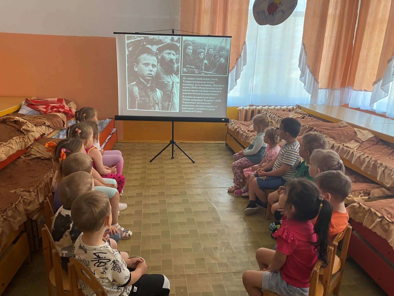 В нашем детском саду было проведено тематическое мероприятие, посвящённое этой дате. В ходе просмотра презентации в доступной форме, детям рассказали о том, как мирные жители узнали, что началась война, как люди пережили военное время и помогали фронту. Ребята познакомились с героическими поступками простых людей и детей, узнали, как была объявлена победа нашей страны. В конце мероприятия дети почтили память погибших минутой молчания.
