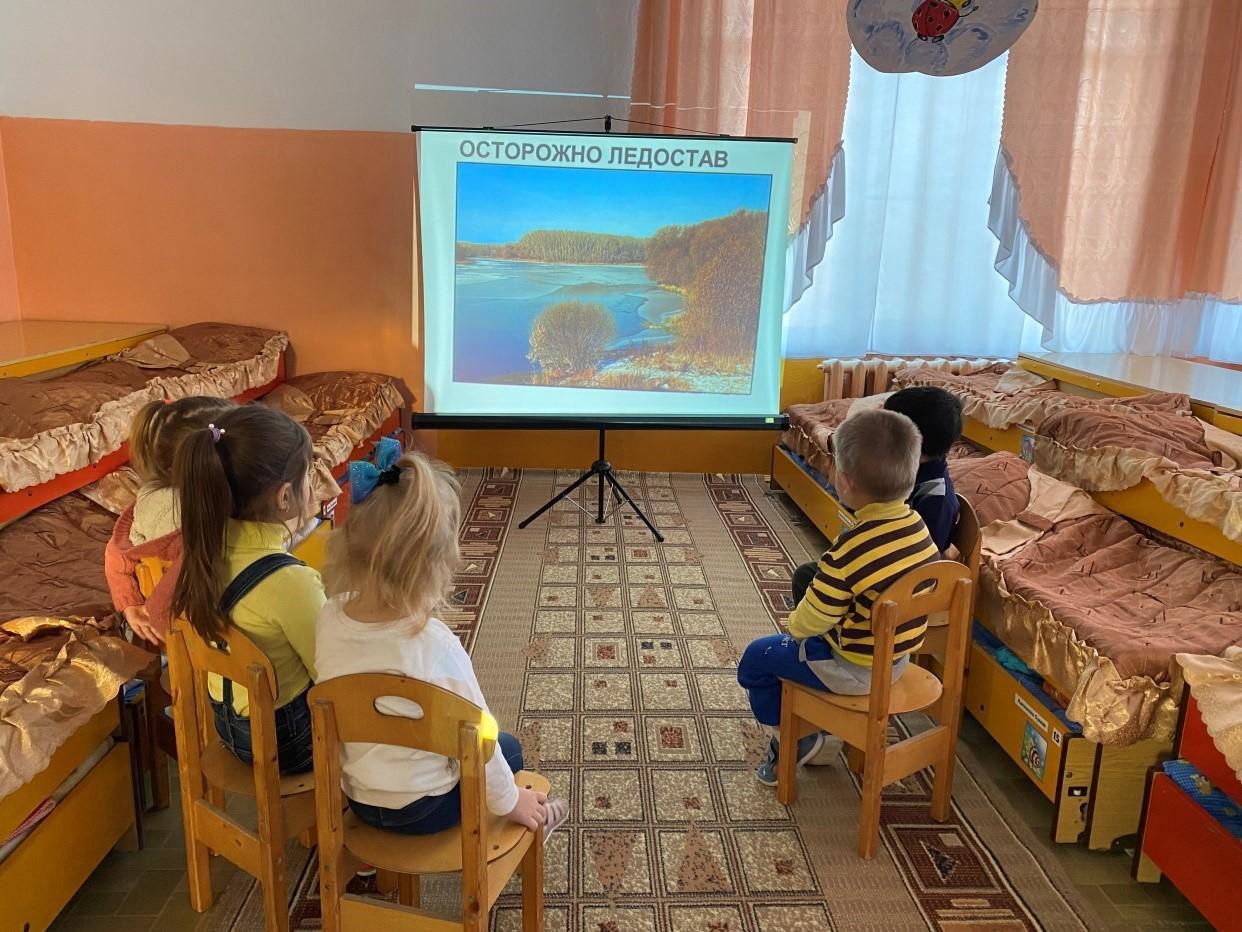 Из тематической презентации воспитанники узнали, как правильно себя вести во время осеннего ледостава, какие правила надо знать и соблюдать, чтобы не попасть в беду.