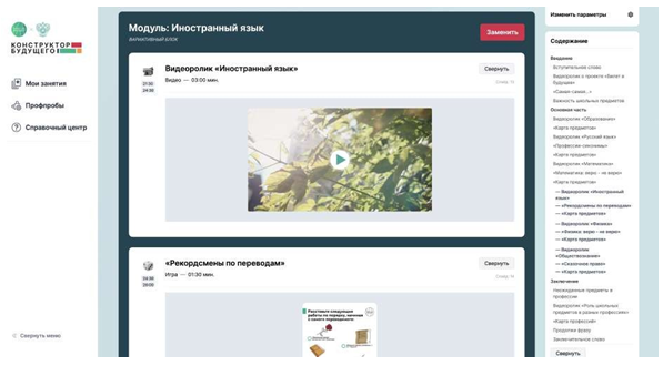 Доходим до модуля с кнопкой «Заменить». Вначале Инга захотела включить в занятие иностранный язык, но, изучив контент, подумала, что может отдельно использовать его в рамках своих уроков английского, а в профориентационном уроке лучше выбрать предметы, которые будут полезны, например, её ученикам из химико-биологического класса.